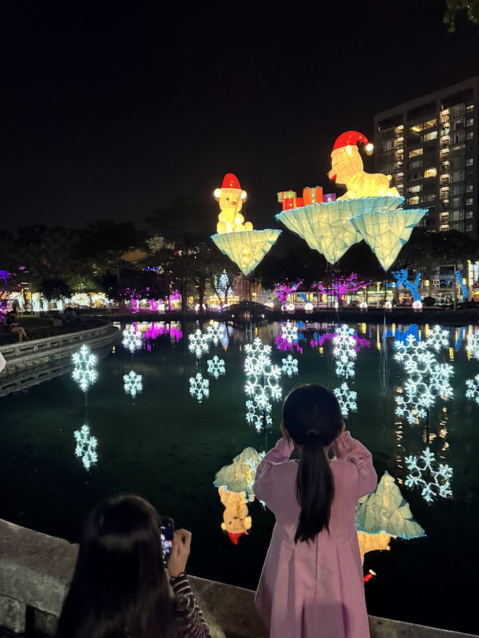 一走進公園,最先被吸引的是水面上的那座冰山。 看見那隻戴著紅色聖誕帽的小熊,坐在浮冰上拿著釣竿垂釣,那種呆萌又專注的模樣,讓人忍不住會心一笑。雖然屏東不會結冰,但看著這些漂浮在水上的光影倒影,好像真的稍微感覺到了一點北國的涼意。