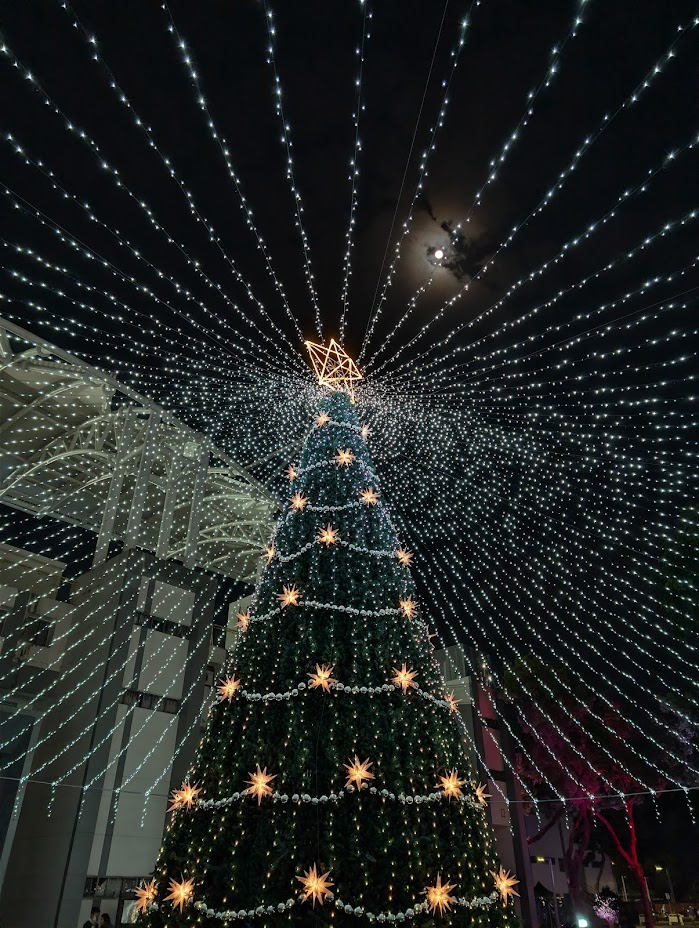 當然,不能錯過那棵巨大的聖誕樹。 上面已經亮起了「2025」的燈牌。看著它矗立在夜色裡,閃著金黃色的光芒,心裡突然有一種「啊,一年又要過去了」的實感。不是感傷,而是一種準備好迎接新開始的期待。